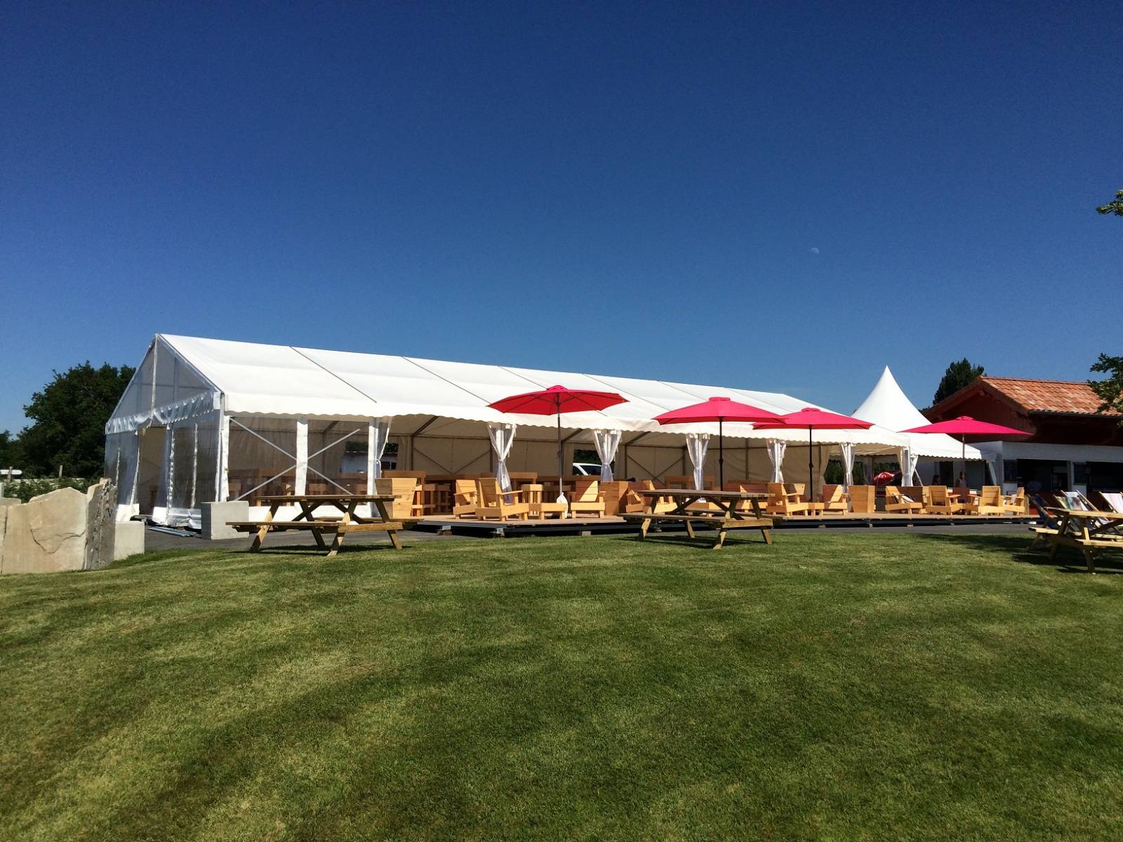Souvent les clients pensent "chapiteaux" pour la pluie. Mais un chapiteau est aussi un élément essentiel d'un événement. Il trouvera aussi toute son utilité en cas de beau temps. Il abritera vos convives et la nourriture des rayons direct du soleil.